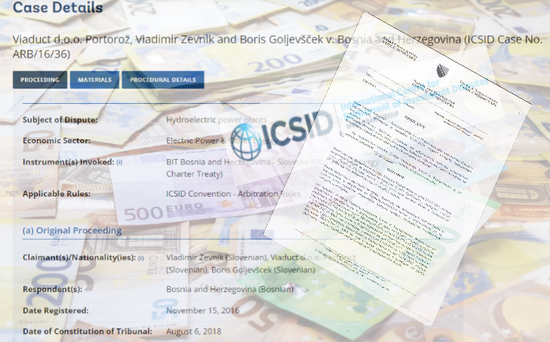 Viaduct d. o. o. Portorož, Vladimir Zevnik i Boris Goljevšček iz Pirana, Republika Slovenija, pokrenuli su arbitražni postupak protiv BiH pred Međunarodnim centrom za rješavanje investicijskih sporova u Vašingtonu radi naknade štete prouzrokovane kršenjem odredbi Sporazuma o recipročnom unapređenju i zaštiti investicija između Bosne i Hercegovine i Republike Slovenije i Ugovora o energetskoj povelji. Razlog je nemogućnost realizacije, odnosno raskidanje ugovora o koncesiji za izgradnju hidroenergetskog sistema na Vrbasu, koji je zaključen s Vladom Republike Srpske.