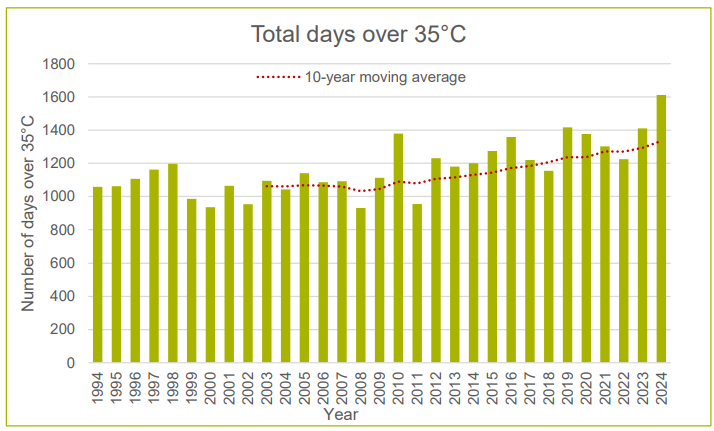 Broj dana sa temperaturom iznad 35°C u ovim gradovima porastao je za 26% u periodu od 31 godine koji je predmet istraživanja, sa prosječnih 1.062 godišnje u periodu 1994-2003. na 1.335 u peridou 2015- 2024.