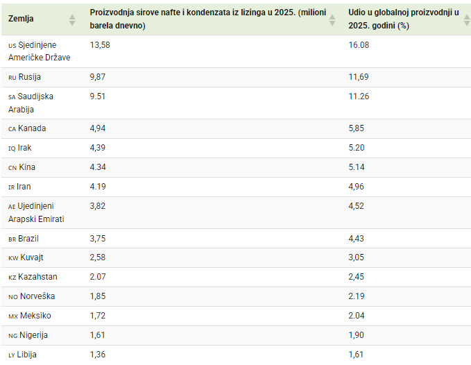 Samo pet zemalja je proizvelo polovinu svjetske nafte u 2025. godini, pri čemu su SAD, Rusija i Saudijska Arabija činile gotovo 40% globalne ponude.