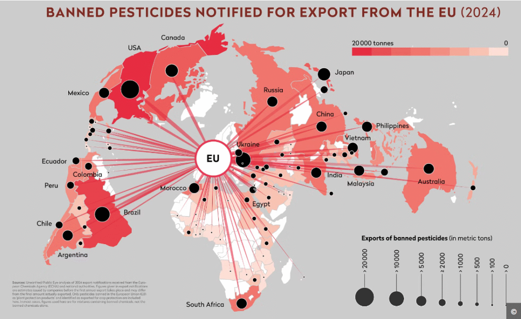 Naglo povećanje rezultat je činjenice da je EU u proteklih sedam godina zabranila upotrebu desetina pesticida zbog dokaza o njihovoj štetnosti po ljudsko zdravlje i životnu sredinu. Ipak, proizvođačima je i dalje dozvoljeno da te iste supstance izvoze u zemlje sa slabijim propisima.